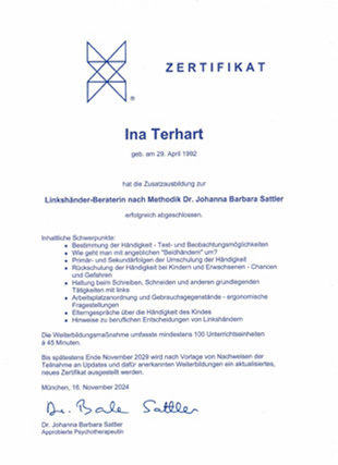 - Zusatzausbildung zur zertifizierten Linkshänder-Beraterin nach Dr. Johanna Barbara Sattler
